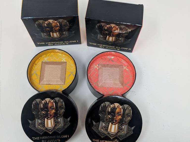 If you haven't already heard, or read my past post about Juvia's Place(I'll link it below this post!), professing my undying love for their ultra-pigmented palettes, then you may have a small problem grasping the TOTAL adoration I have for today's fabulous find!! Listen, no matter what, a girl's GOTTA glow! Juvia's Place released their own line of BLINDING highlight shades that include both loose and solid forms of the product. One of the things I appreciate most about Juvia's are the curated sets, n which you are able to try multiple items at a more discounted rate than if you were to purchase them separately. I scored one such set for my birthday bag this year, which included 2 pressed shades(Heroine Glow I&II), 1 loose shade(Heroine), and 1 Highlight and Blending Brush. Today we are going to focus on the pressed versions, but TRUST, I will speak on the rest of the collection shortly...
